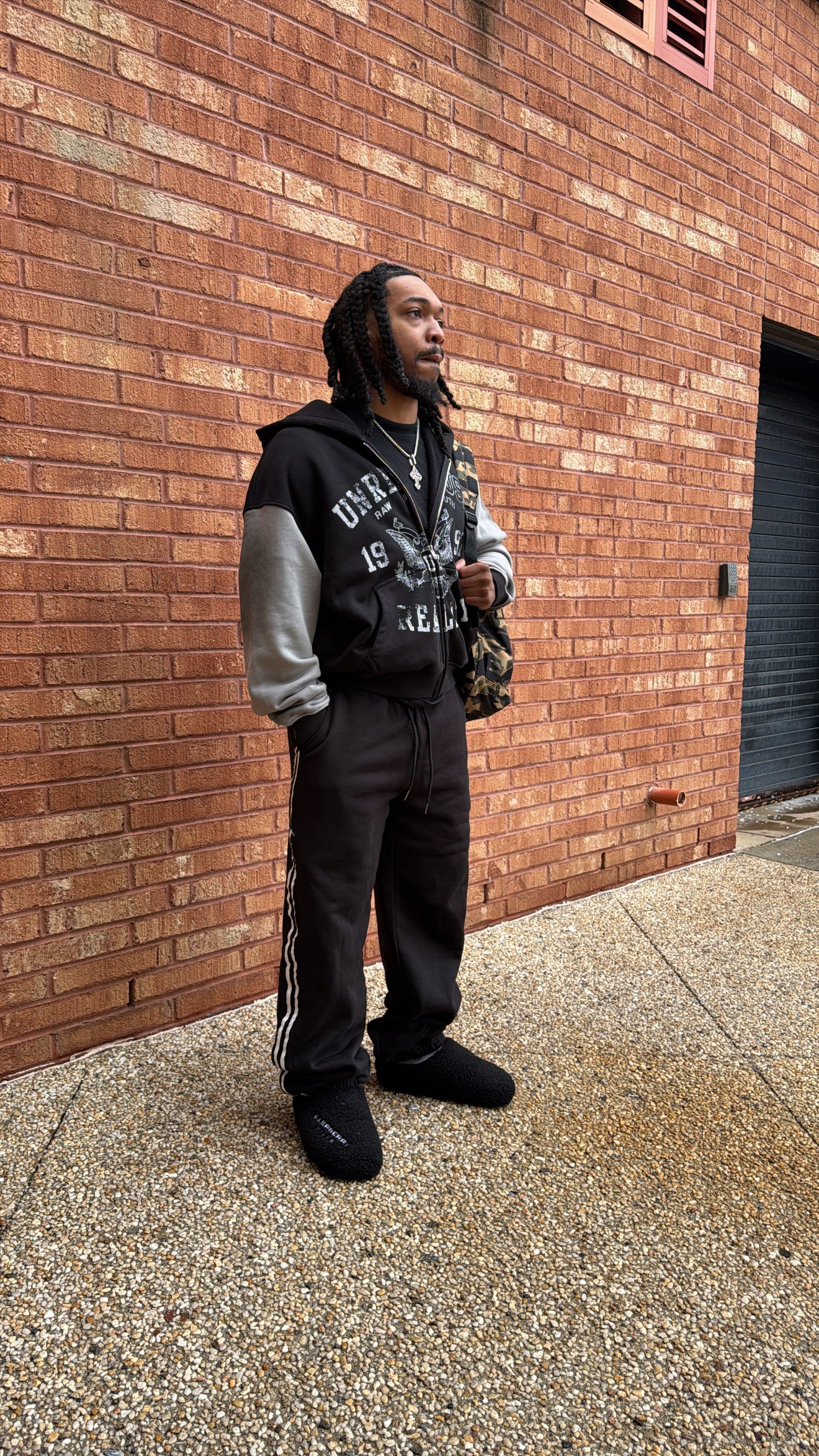 The zip-up hoodie features distressed graphics and layered sleeves that give it a worn-in, lived-in look. The matching sweatpants sit relaxed with a clean silhouette. Whether you’re running errands, traveling, or just outside moving at your own pace, this set holds its shape and feels right.